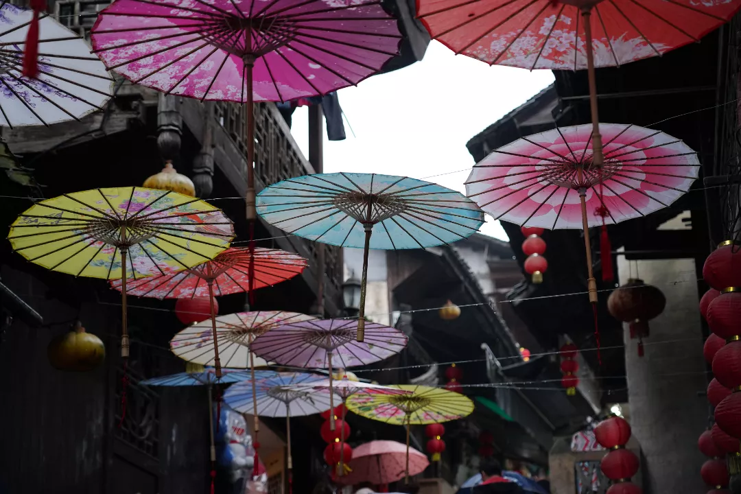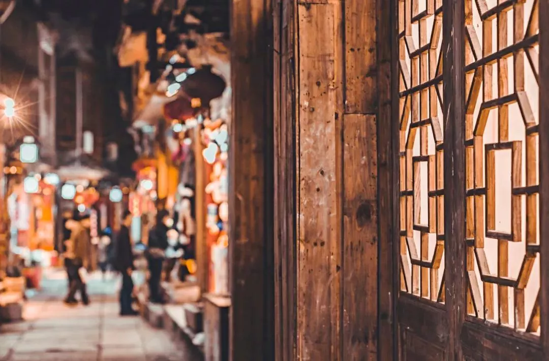 老街上,灯笼挂满檐下,油纸伞挂在头顶,岁月染旧木窗木门,青石板铺成小路,路两旁摊上摆满琳琅满目的小玩意儿,随处可听见响亮的吆喝声……
