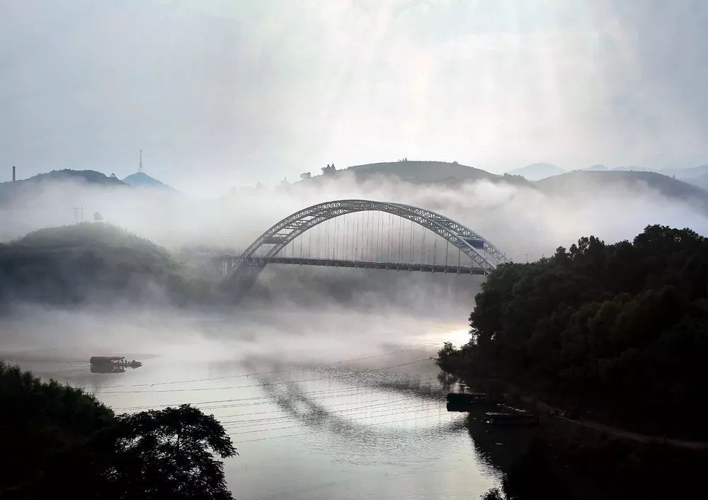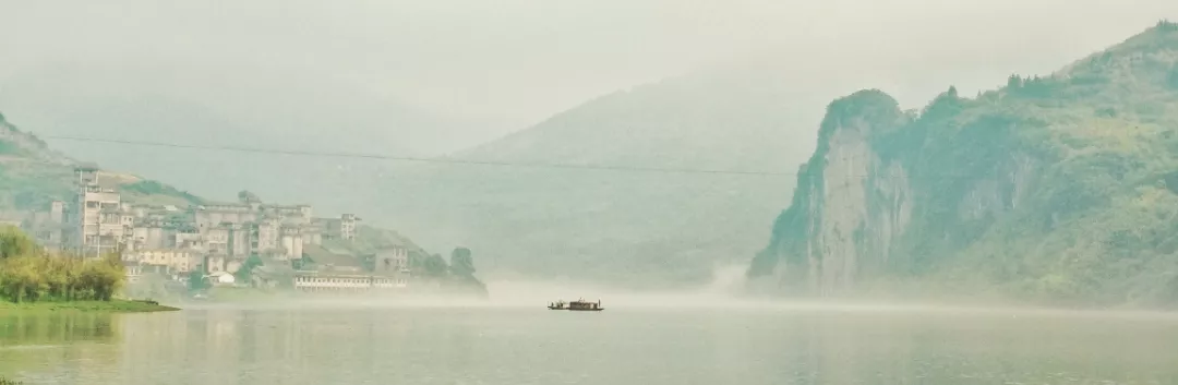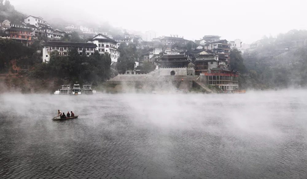 拂晓,酉水雾漫,蝉纱般的晨雾袅袅娜娜,在两岸崖壁峡谷间飘拂,如幻如梦的仙雾中,远处一叶轻舟出没烟波里,摇橹渔夫蓑衣斗笠,有着古诗里的深邃意境。