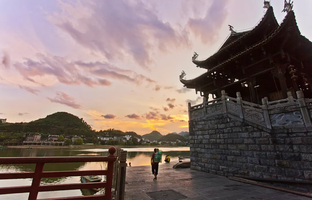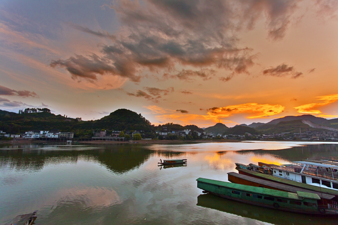 傍晚,夕阳西下,酉水河就从淡雅的水墨丹青变成了浓墨重彩的油画。落日余晖映晚霞,水面就像一面镜子,倒映着天地间的美,也把多彩的晚霞收入囊中。红日、浮云、天空、河面,光与影的重叠,构成一幅最美的图景。